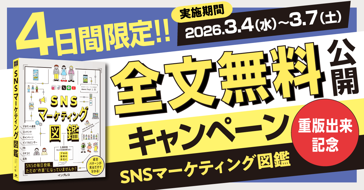株式会社インプレスは、書籍『SNSマーケティング図鑑』の重版出来を記念して、2026年3月4日(水)~3月7日(土)の4日間限定で全文無料公開キャンペーンを実施いたします。